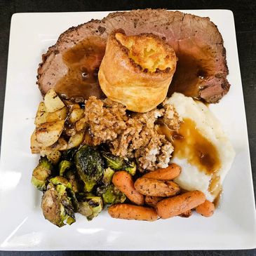 We serve a traditional Sunday Roast every week from noon until it's gone! The meat selection alternates weekly between Beef and Lamb. Sides include Roasted Potatoes, Mashed Potatoes, Stuffing, Roasted Vegetables, Yorkshire Pudding, and Gravy.